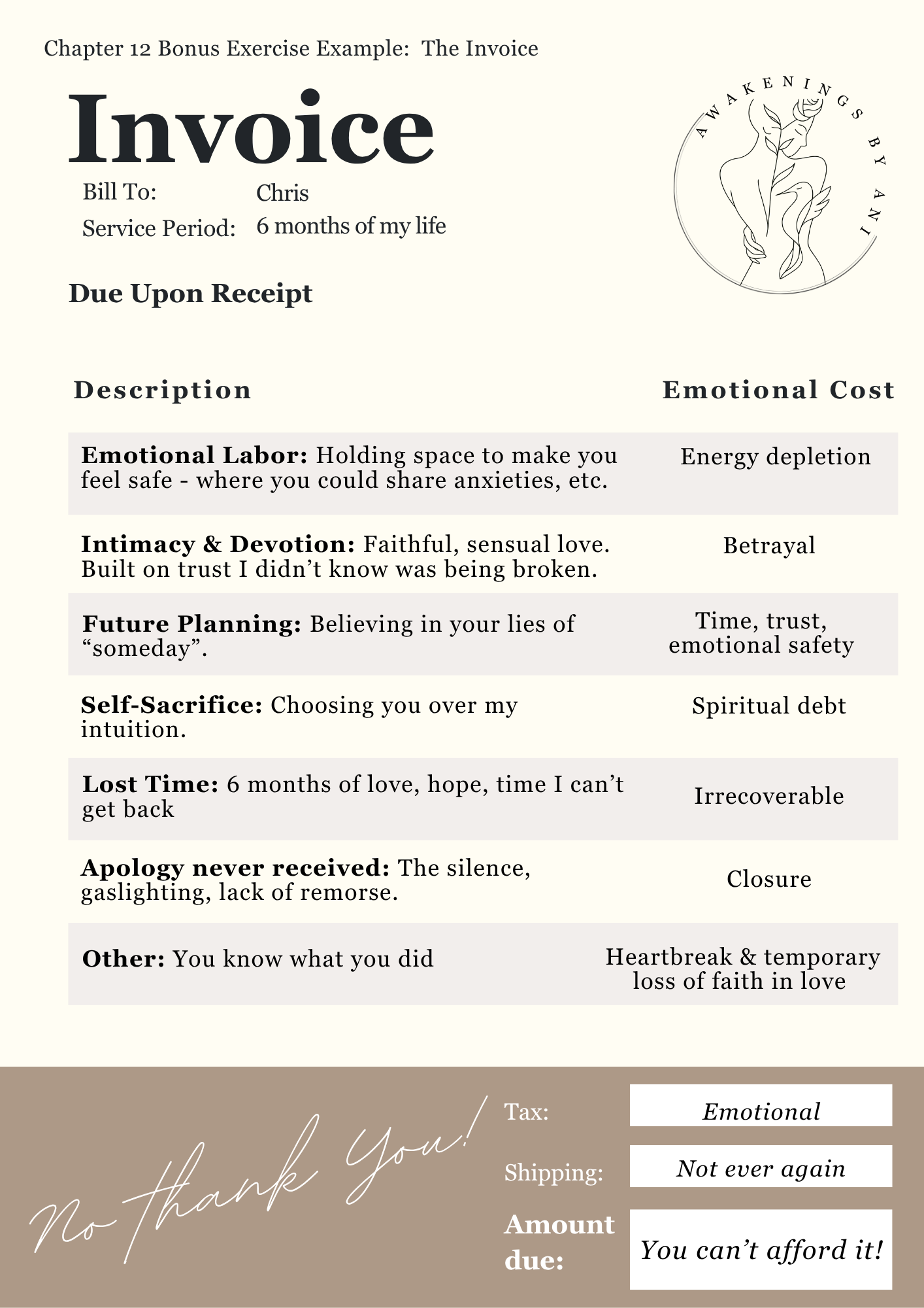 Creating your own invoice isn’t about revenge or repayment. It’s about acknowledgment. It’s about seeing your worth in black and white — and letting that awareness become the start of your healing.